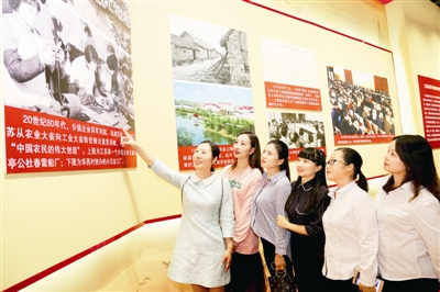 作为江苏40周年改革开放巨大成就的“样板”,本次图片展上有不少“华西元素”:《序厅:改革开放40年江苏先进模范人物》中展示了当年筚路蓝缕的老书记吴仁宝,《江苏时代楷模》中展示了吴协恩书记个人照片,《历史跨越:住:从“住有所居”到“住有宜居”》中展示了华西村四代民居的变迁历程,此外还有几十年来华西村在工业、农业、商业方面日新月异的发展……11张图片多方位勾勒出华西村的发展全貌。