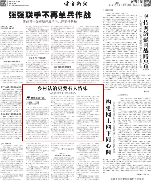 法制日报 刊登了专题报道《乡村法治更要有人情味——访华西村党委书记吴协恩》报道中说:“真正了解干部当得怎么样、做得怎么样,基层群众最有发言权。我们就创立这套民主测评制度,以无记名方式,让他们对企业管理层、村委班子、企业党支部书记、联户组长等打分,包括我也是他们的评测对象。”吴协恩说道。