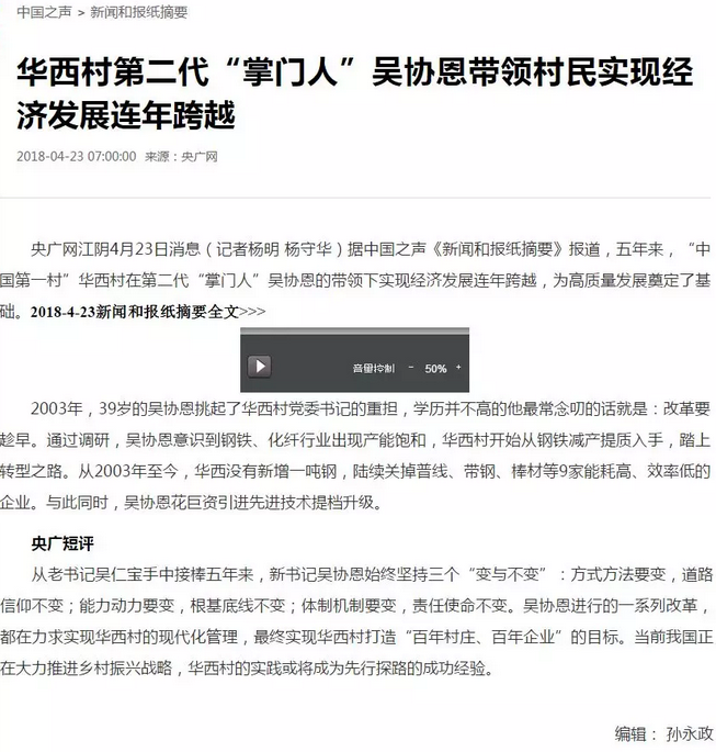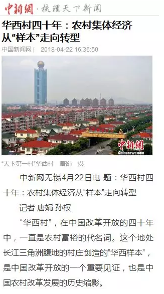 中国新闻网 播发了专题报道《华西村四十年:农村集体经济从“样本”走向转型》。文章中说:“华西村”,在中国改革开放的四十年中,一直是农村富裕的代名词。这个地处长江三角洲腹地的村庄创造的”华西样本”,是中国改革开放的一个重要见证,也是中国农村改革发展的历史缩影。