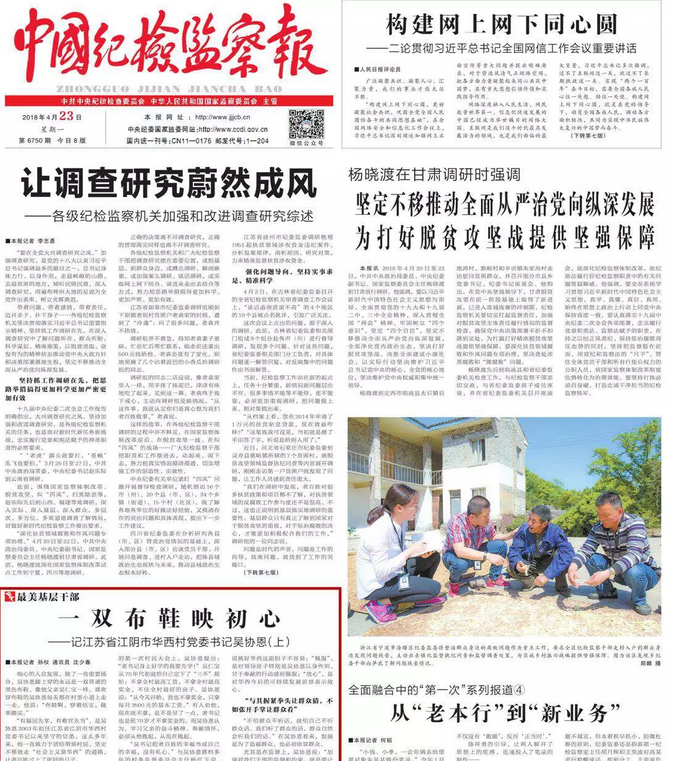 从4月22日开始,新华社、中央广播电视总台“中国之声”、光明日报、中国纪检监察报、工人日报、农民日报、法制日报、中国新闻网等从中央到地方各级媒体,开始集中宣传“全国最美基层干部”华西村党委书记吴协恩的先进事迹——