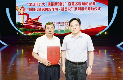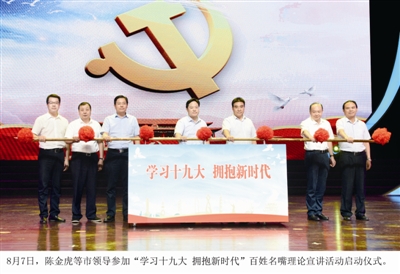 发挥百姓名嘴作用,用群众喜闻乐见的形式宣讲党的十九大精神。8月7日,江阴市在华西启动“学习十九大 拥抱新时代”百姓名嘴理论宣讲暨“新时代新思想新作为·基层说”系列活动。无锡市及江阴市领导陈金虎、袁飞、崔荣国、余银龙、程政参加活动。活动现场,无锡市委常委、江阴市委 书记向党的十九大代表、华西村党委书记吴协恩颁发了理论宣讲顾问聘书。