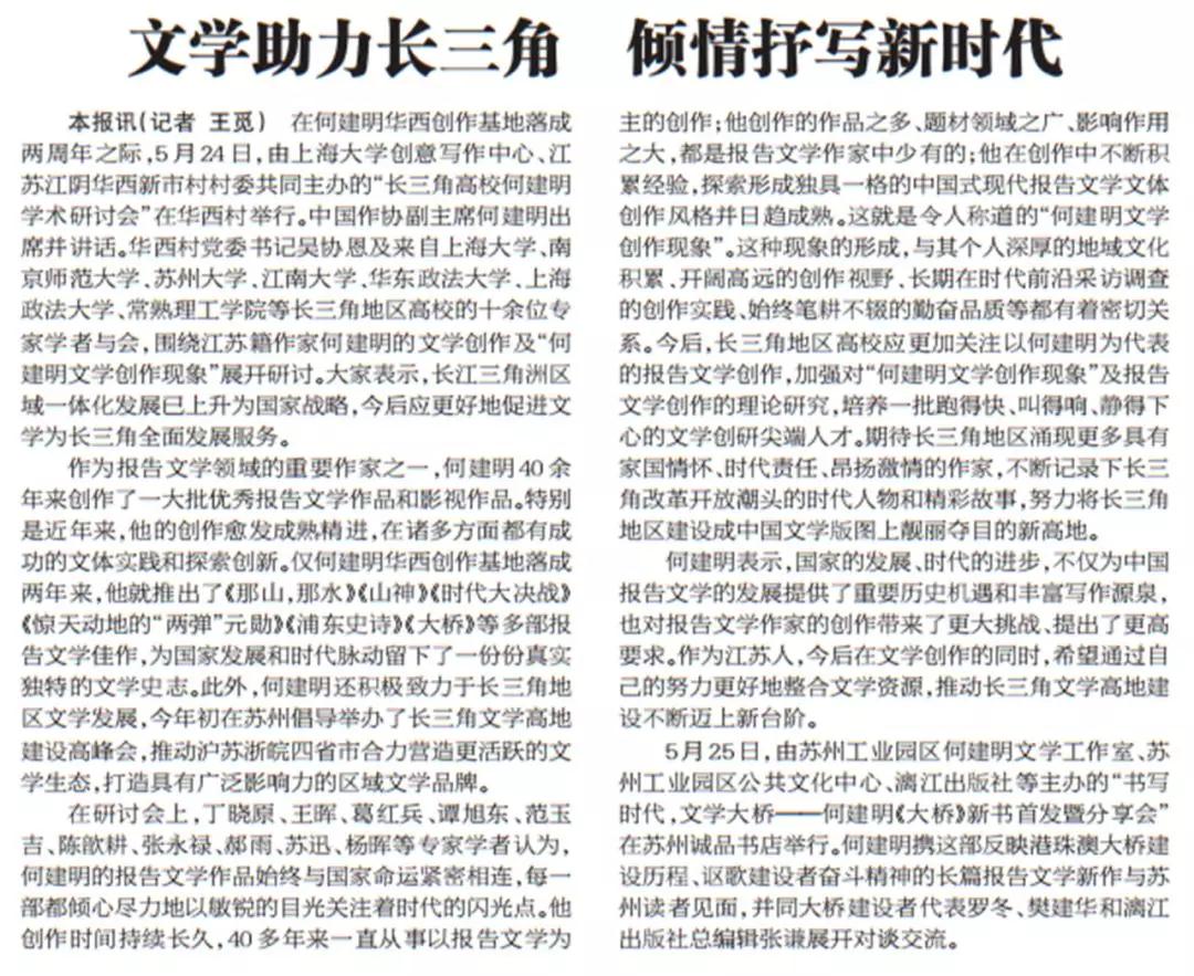 6月3日的《文艺报》,在头版以《文学助力长三角,倾情抒写新时代》为题,对在华西村召开的“长三角高校何建明学术研讨会”进行了报道。文中称:在何建明华西创作基地落成两周年之际,5月24日,由上海大学创意写作中心、江苏江阴华西新市村村委共同主办的“长三角高校何建明学术研讨会”在华西村举行。中国作协副主席何建明出席并讲话。华西村党委书记吴协恩及来自上海大学、南京师范大学、苏州大学、江南大学、华东政法大学、上海政法大学、常熟理工学院等长三角地区高校的十余位专家学者与会,围绕江苏籍作家何建明的文学创作及“何建明文学创作现象”展开研讨。大家表示,长江三角洲区域一体化发展已上升为国家战略,今后应更好地促进文学为长三角全面发展服务。