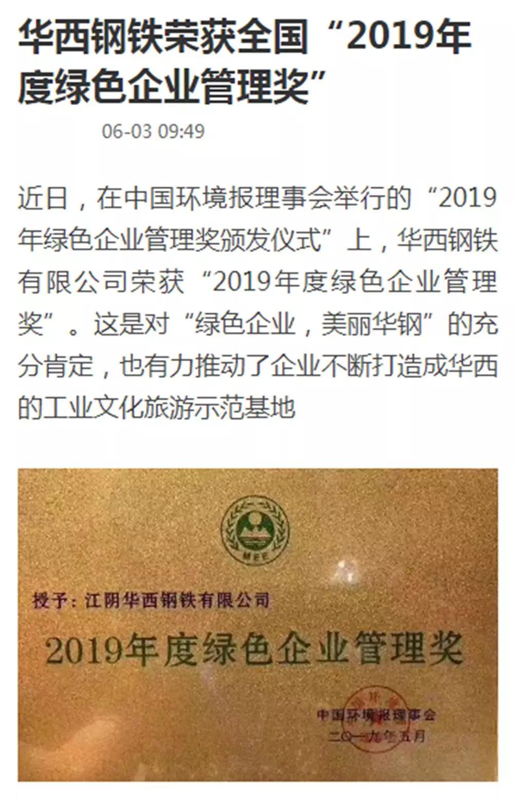 5月3日的网易”今日热闻“,推出了华西钢铁有限公司荣获全国”2019年度绿色企业管理奖“的新闻,再一次彰显了”绿色企业,美丽华钢“的新风采——