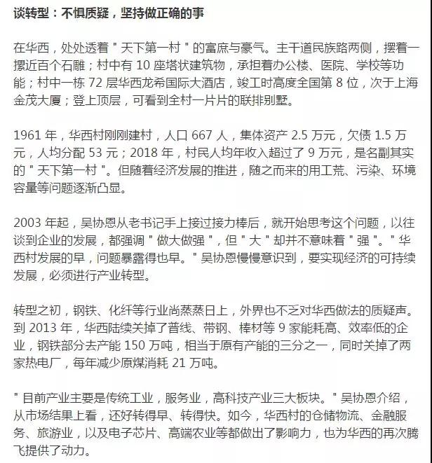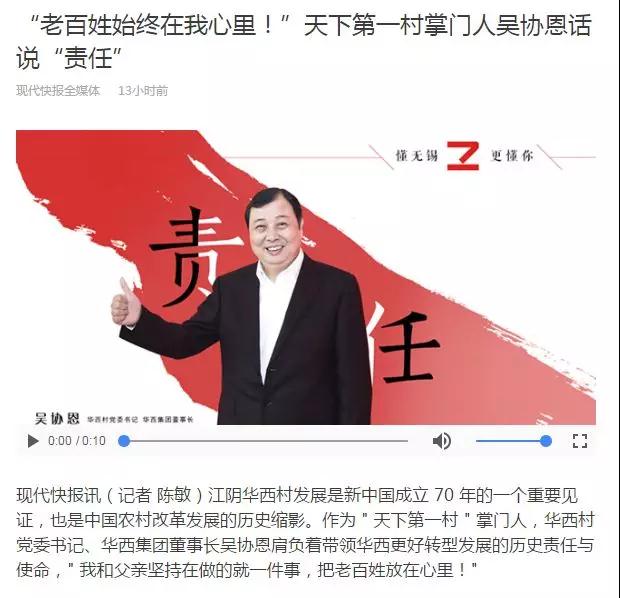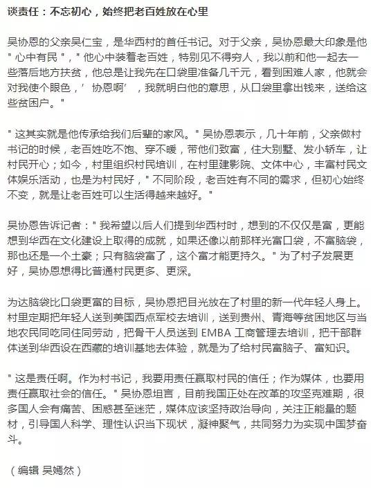 6月17日的《现代快报》,在刊登的《“只坚持一件事:把老百姓放在心里” ——华西村党委书记、华西集团董事长吴协恩话责任》一文中称:肩负着带领华西更好转型发展的历史责任与使命,作为“天下第一村”掌门人,华西村党委书记、华西集团董事长吴协恩说:“我和父亲坚持在做的就一件事,把老百姓放在心里!”