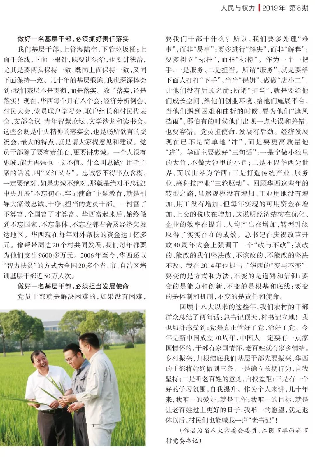 由江苏省人大常委会主管、江苏省人大常委会研究室主办的《人民与权利》杂志,在今年第8期的“主题教育”专栏,推出江苏省人大常委会委员、华西村党委书记吴协恩的署名文章——《不忘为民初心 牢记发展使命》。吴书记从“守牢为民初心”“查找自身差距”“抓好责任落实”“担当发展使命”这四个方面,介绍了自己做好一名基层干部的实践和体会。