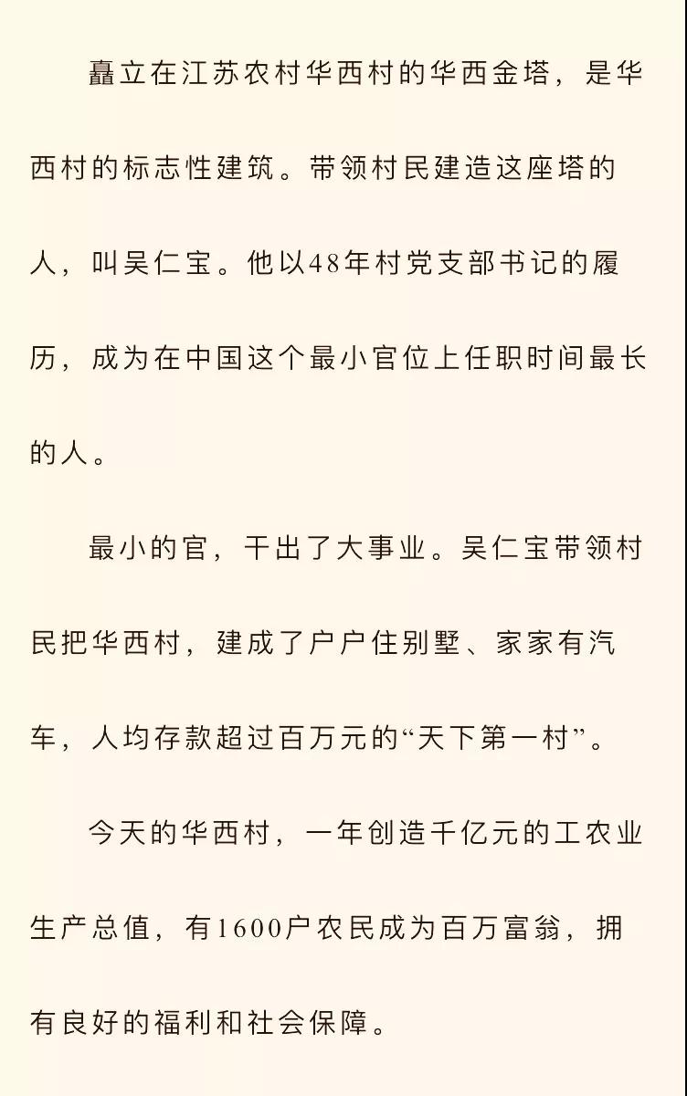 近日,由人民出版社出版发行的《为了初心和使命——中国共产党一路走来的故事》一书,对华西村和吴仁宝老书记给予了较高评价。文中称:改革开放40年的实践映照了中国的梦想在今天的现实。矗立在江苏农村华西村的华西金塔,是华西村的标志性建筑。带领村民建造这座塔的人,叫吴仁宝。他以48年村党支部书记的履历,成为在中国这个最小官位上任职时间最长的人。最小的官,干出了大事业。吴仁宝带领村民把华西村,建成了户户住别墅、家家有汽车,人均存款超过百万元的“天下第一村”。