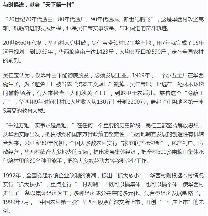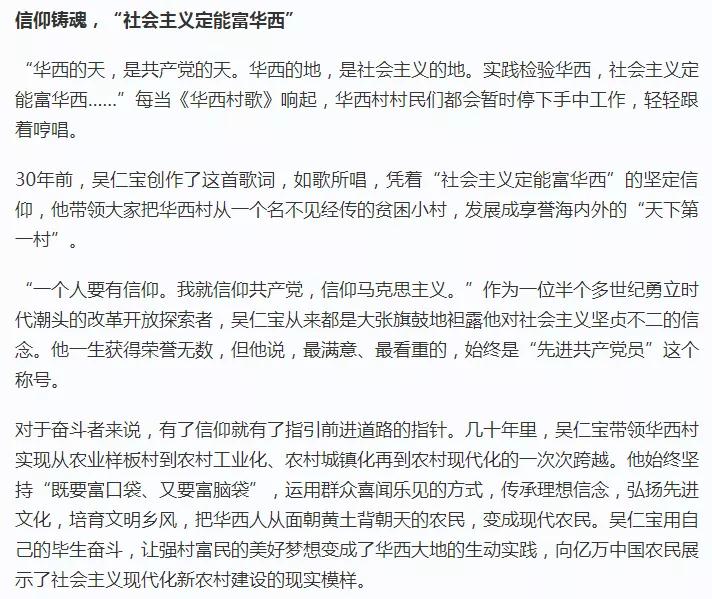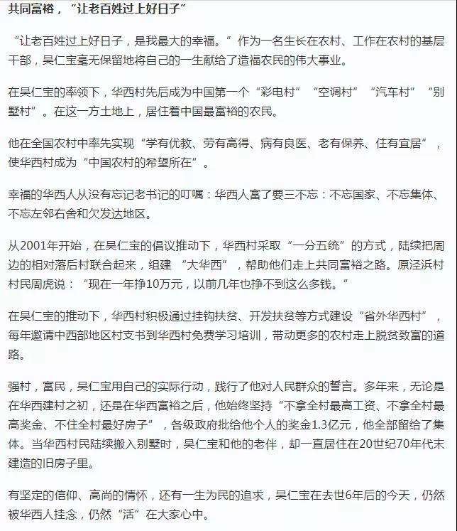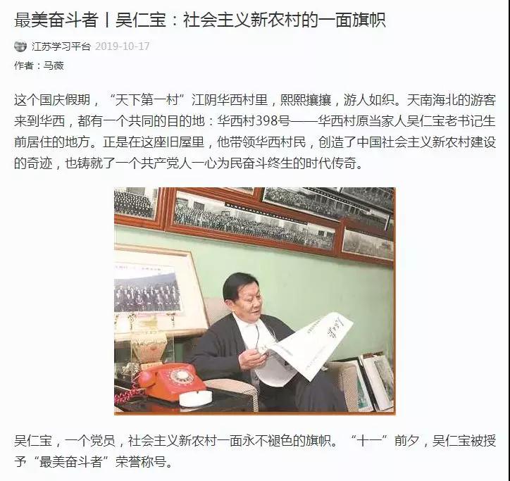 10月17日,中共中央宣传部主管的“学习强国”,以《最美奋斗者丨吴仁宝:社会主义新农村的一面旗帜》为题,推出了老书记的先进事迹。文中称:华西村398号——华西村原当家人吴仁宝老书记生前居住的地方。正是在这座旧屋里,他带领华西村民,创造了中国社会主义新农村建设的奇迹,也铸就了一个共产党人一心为民奋斗终生的时代传奇。